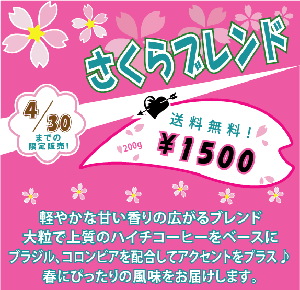 【さくらブレンド】春限定のオリジナルブレンド 華やかな香りと優しい飲み心地のマイルドテイストのブレンドです。